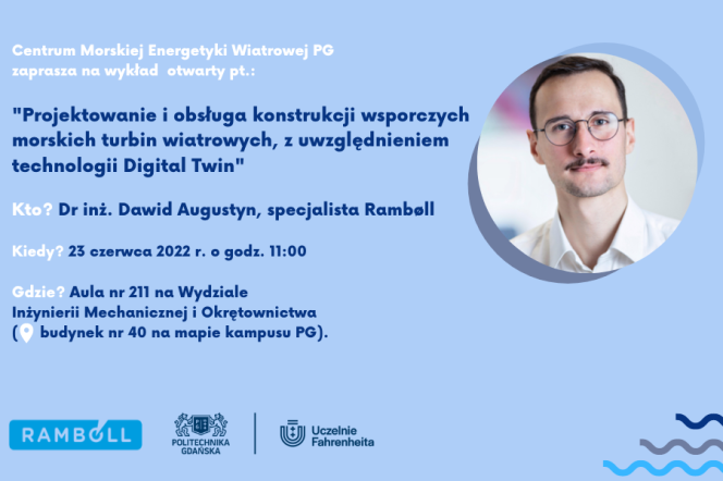 Centrum Morskiej Energetyki Wiatrowej Politechniki Gdańskiej serdecznie zaprasza na wykład otwarty dr. inż. Dawida Augustyna pt. "Projektowanie i obsługa konstrukcji wsporczych morskich turbin wiatrowych, z uwzględnieniem technologii Digital Twin".