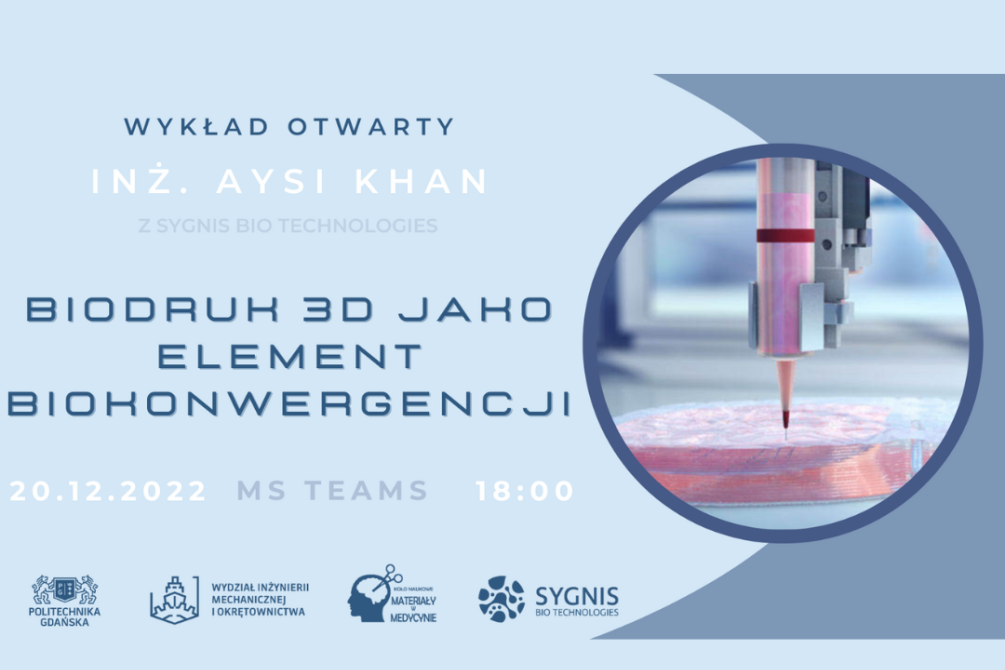 Koło Naukowe 'Materiały w Medycynie' serdecznie zaprasza na Wykład Otwarty zorganizowany w ramach popularyzacji tematyki biomateriałów pt. “Biodruk 3D jako element biokonwergencji”, który wygłosi inż. Aysia Khan, inżynier aplikacyjny, specjalista ds. biodruku 3D w Sygnis SA. Wykład odbędzie się zdalnie 20.12.2022r. (wtorek) o godzinie 18.00 za pośrednictwem platformy MS Teams.