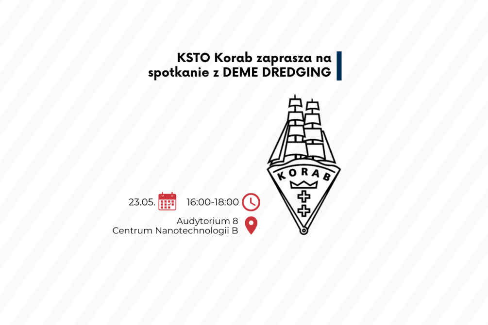 Koło Naukowe KSTO Korab serdecznie zaprasza wszystkich studentów związanych z okrętownictwem, mechaniką i inżynierią brzegową, a także wszystkich zainteresowanych, na wyjątkowe spotkanie z przedstawicielami firmy DEME DREDGING. Wydarzenie to będzie doskonałą okazją do zapoznania się z podstawami pogłębiania oraz do zgłębienia jednego z największych europejskich projektów pogłębiarskich ostatnich dwudziestu lat - „Modernizacja toru wodnego Świnoujście – Szczecin do -12.5 m”.