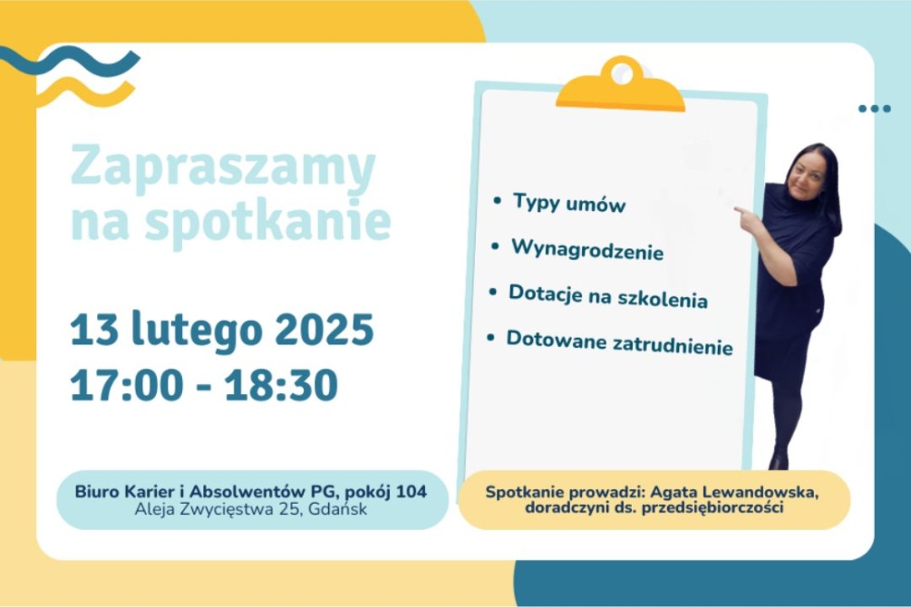 Zapraszamy na warsztaty organizowane przez Biuro Karier i Absolwentów PG, które odbędą się 13 lutego w godzinach 17:00-18:30. Spotkanie poprowadzi Agata Lewandowska, doradczyni ds. przedsiębiorczości.
