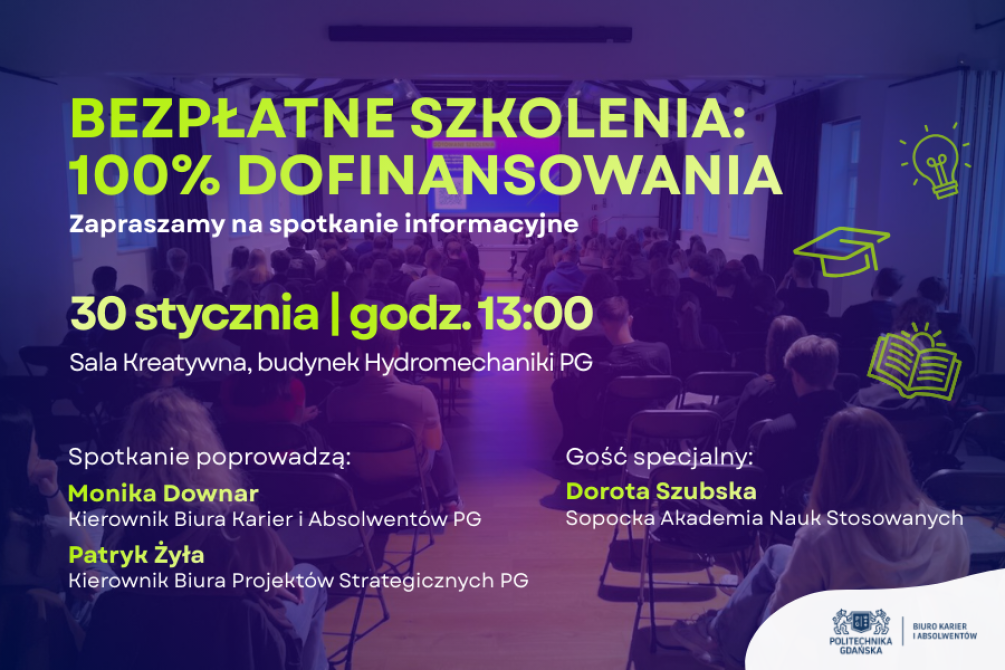 Biuro Karier i Absolwentów Politechniki Gdańskiej oraz Biuro Projektów Strategicznych serdecznie zapraszają na spotkanie informacyjne poświęcone bezpłatnym szkoleniom i kursom, w 100% finansowanym ze środków zewnętrznych.